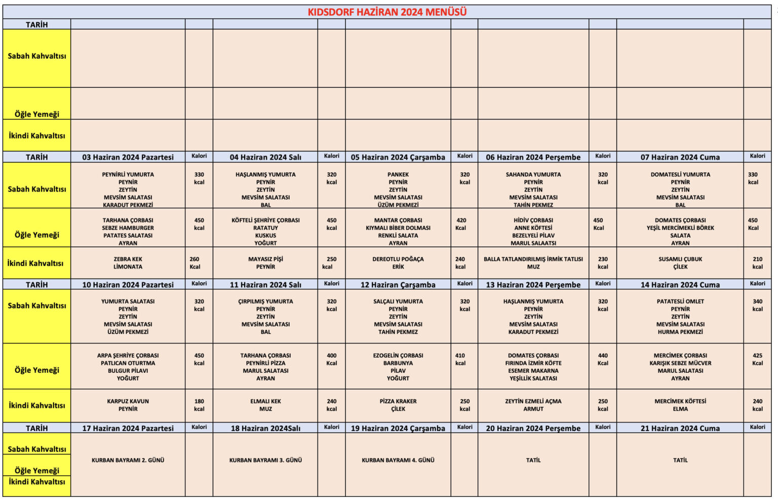 08 Eylül - 12 Eylül Yemek Menüsü